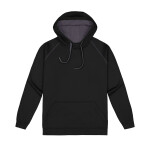 Pullover hood, drop shoulder, kangaroo pocket, zip at front placket, double layer hood, no drawcord, sleeve cuff ribbing